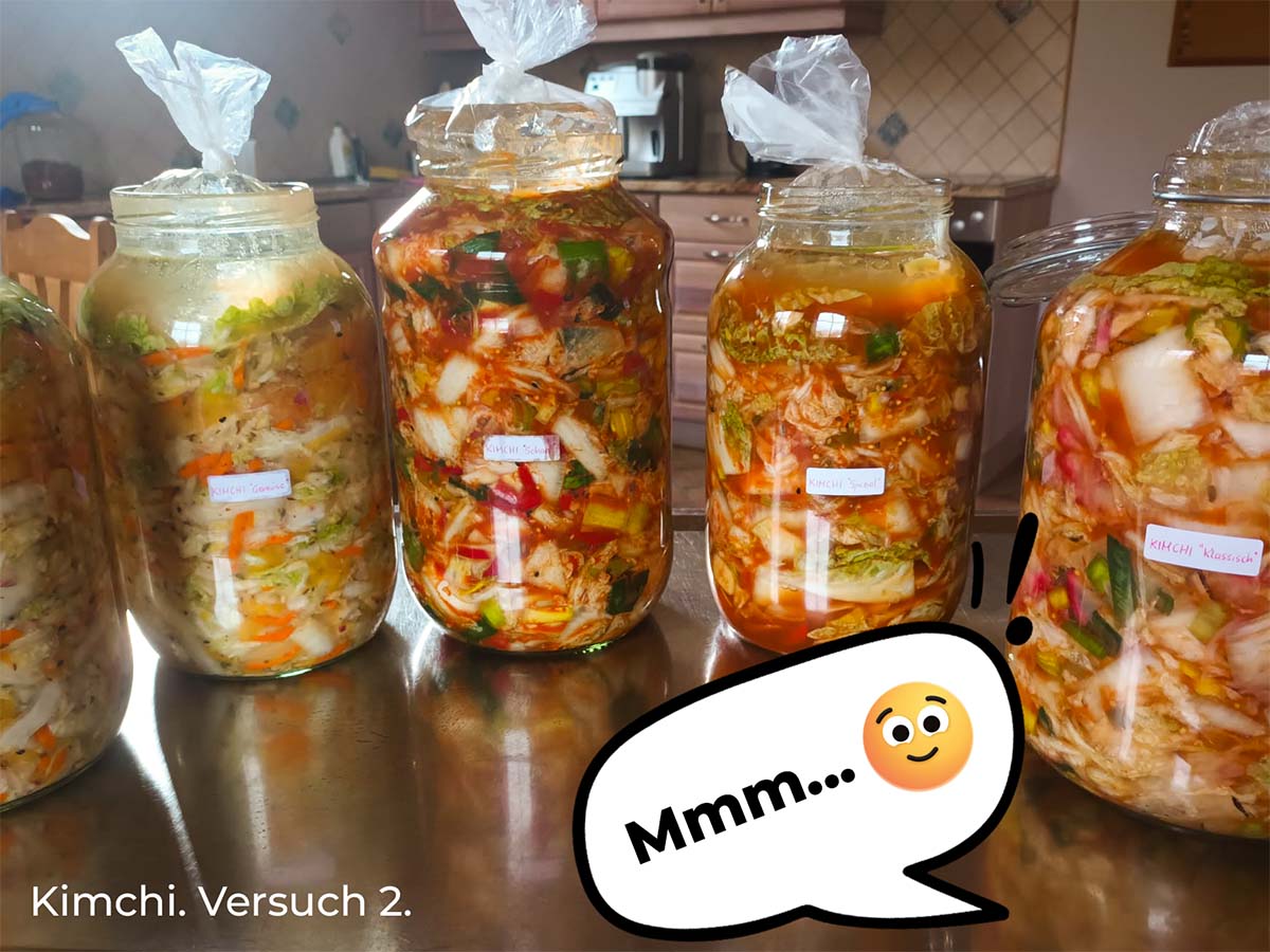 Mein erstes Kimchi vor dreieinhalb Jahren, welches zwei Wochen in einer unspektakulären, durchsichtigen Plastikbox reifte, war eher so „meeh“. „Das war wohl nix!“, so meine Schlussfolgerung. Darauf folgte eine Zeit der Funkstille zwischen mir und der Fermentation. Die Kohlrabiflut im Herbst letzten Jahres hat mich auf der Suche nach neuen Verarbeitungsmöglichkeiten dann jedoch wieder zum Thema zurückgeführt. Diesmal mit (Gott sei Dank!) mehr Erfolg. Das beinahe ewig haltbare Kohlrabi-Kimchi lächelt mich heute noch aus dem Eck des Kühlers an und macht sich mit seinem säuerlich-frischen Geschmack besonders gut im Linsensalat.