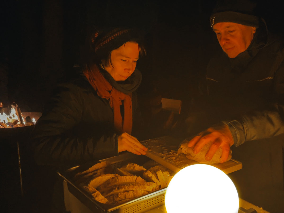 Treffpunkt: Lagerfeuer! Mit Decken und Sitzpolstern ausgestattet trotzten wir dem ungastlich-nasskalten Wetter und lauschten neben den brennenden Scheiten Georgs Gedanken zum Jahreskreis der Natur. Dann gab’s deftiges Aligot (einfache Hirtenmahlzeit aus Frankreich: Kartoffelpüree mit Kürbis und Käse), Störibrot und Punsch.