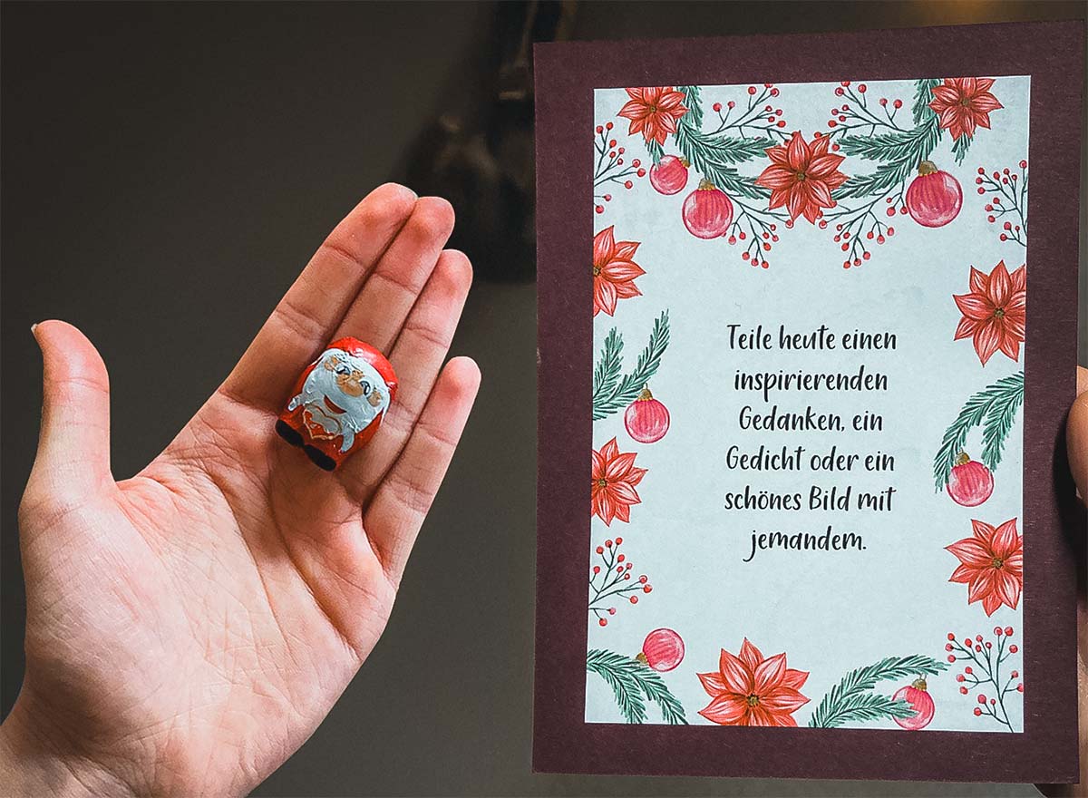 Bei uns helfen jedenfalls traditionelle Aktivitäten im Advent mit, uns auf das Fest am 24. einzustimmen. „Weihnachtsfan“ Johanna hat mit einem Gemeinschaftsadventkalender überrascht, der außer einer süßen Überraschung auch kleine Aufgaben verborgen hielt. Jeder von uns bekam an seinem Tag des Türchenöffnens einen solchen Auftrag mit auf den Weg.