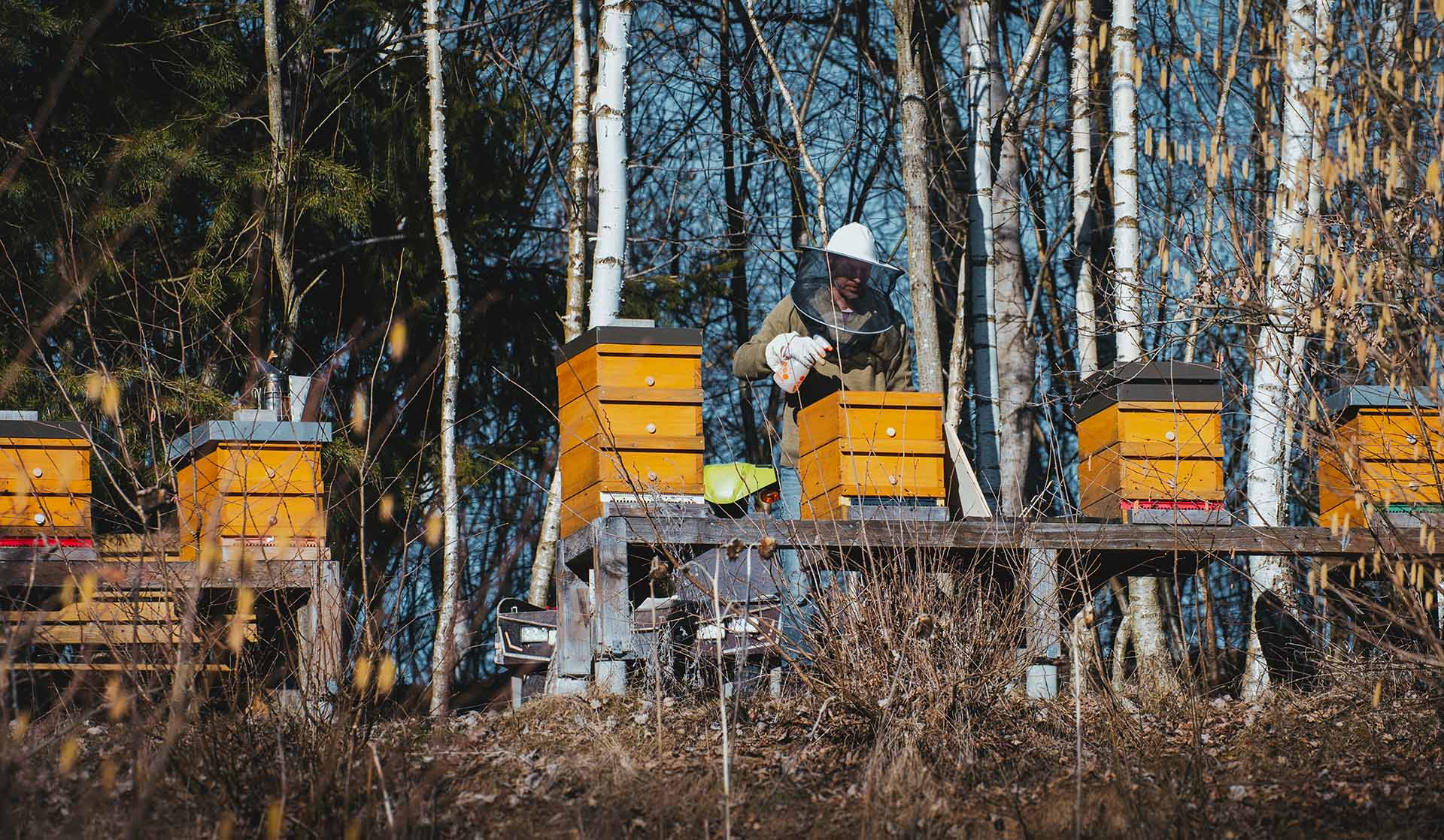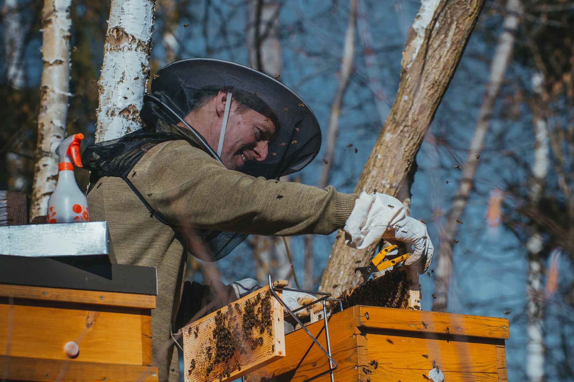 Mit unverkennbarer Freude und bei strahlendem Sonnenschein nimmt Markus, unser Bienenvater, am 27. Februar die erste Frühjahrsdurchsicht bei seinen 17 Völkern vor. "Ich habe bereits beobachtet, dass einige Bienen Pollen einbringen: Ein Zeichen, dass frische Brut vorhanden ist - und das bereits im Februar!"