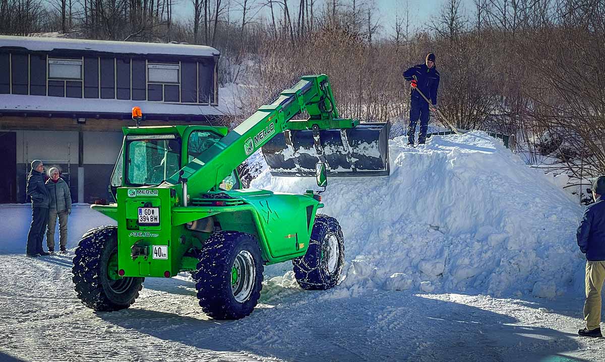 Perfekt ausgerüstet mit Tatendrang und Schaufeln schauten wir erst einmal zu, wie unser guter Merlo mit seiner "Riesenschaufel" die vorbereitenden Grobarbeiten vornahm und unter Bernhards kundiger Führung Schnee über Schnee zusammenschob, auftürmte und festklopfte. Die Baubedingungen waren deshalb nicht optimal, weil der Schnee wegen der extremen Kälte nicht "pickte", sondern pulvrig herumstaubte und sich nur schwer verdichten ließ.