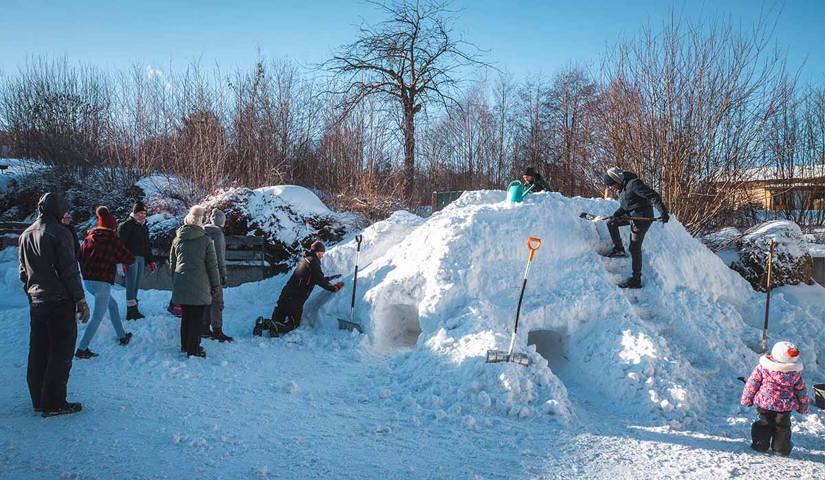 Am Sonntag, den 11. Jänner, hat Doris ihr Morgengebet unter anderem dazu genutzt, eine gemeinschaftliche Großbaustelle der besonderen Art ins Leben zu rufen. Angesichts des üppig vorhandenen kalt-weißen Baumaterials lud sie uns alle am Nachmittag in den Hof zur großen Schneeburg-Werkstatt für die Kinder ein. Gesagt, getan!